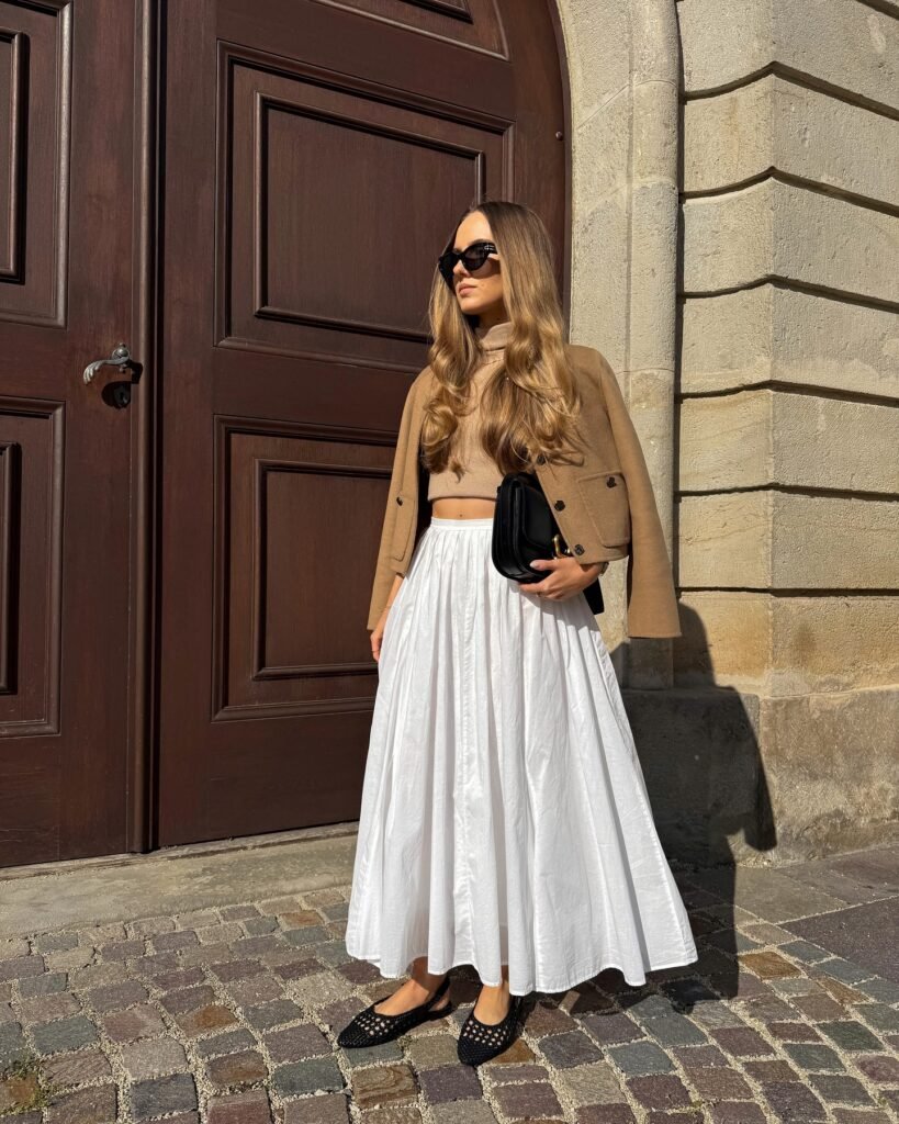- Fitted tops keep the silhouette balanced.