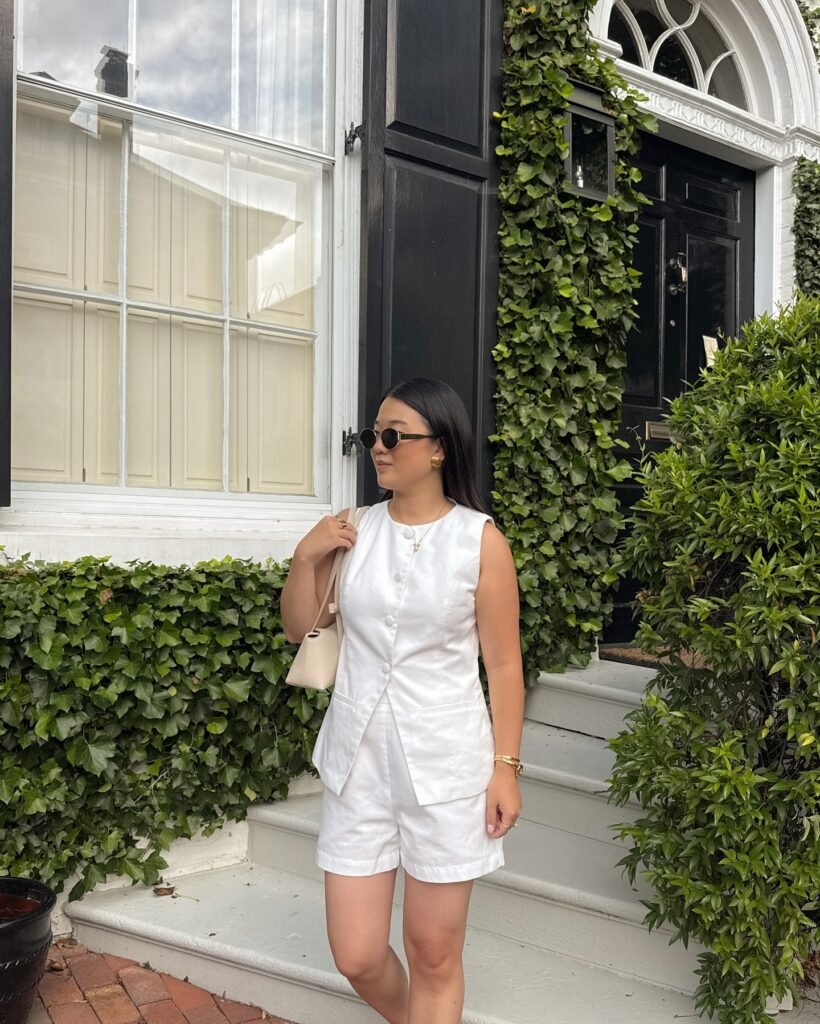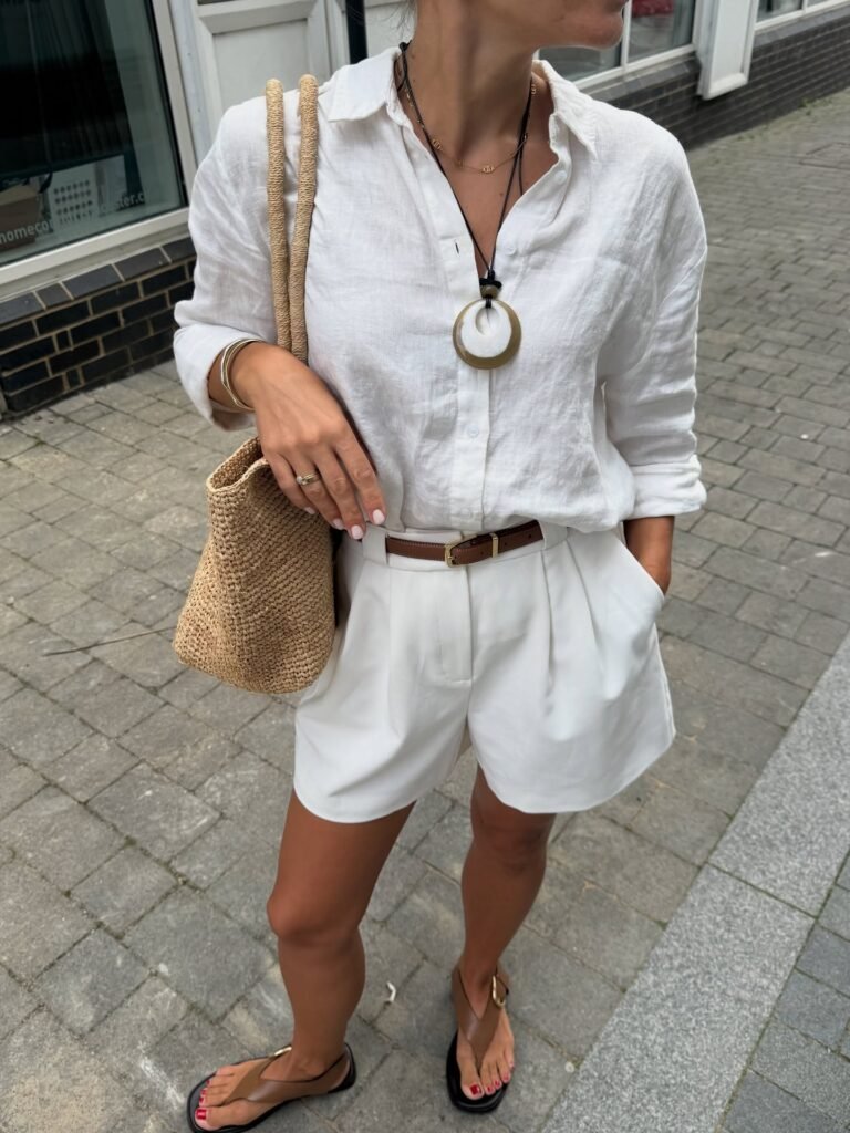 I wear an oversized white linen button-down with taupe tailored shorts, and it somehow gives “minimalist cool girl who reads at coffee shops” energy without trying.