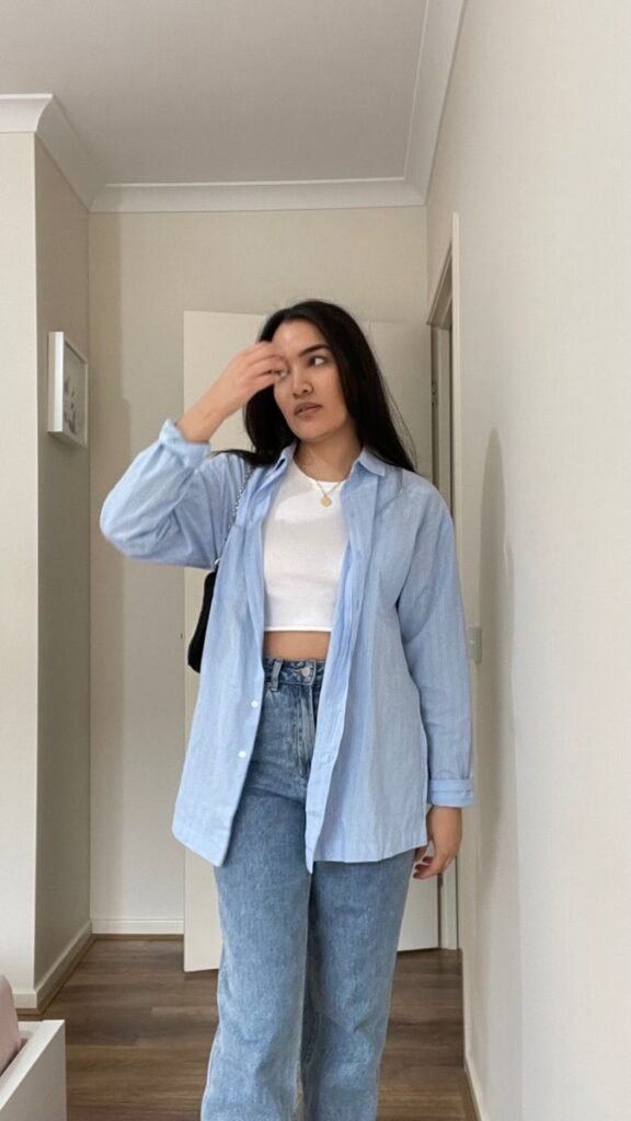 Start with a tank in white, grey, or even a light stripe, then layer a denim shirt over the top — worn open like a jacket. Finish with mid-wash straight-leg jeans. The tank underneath does all the heavy lifting by keeping the look from feeling too heavy or matchy.