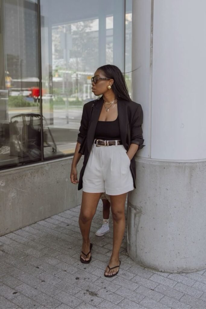 Go for a slightly oversized blazer — one that hits just below the hip — in a neutral like grey, beige, or black. Pair it with a fitted tank and high-waisted tailored shorts in a matching or complementary fabric. The result reads put-together without trying too hard.