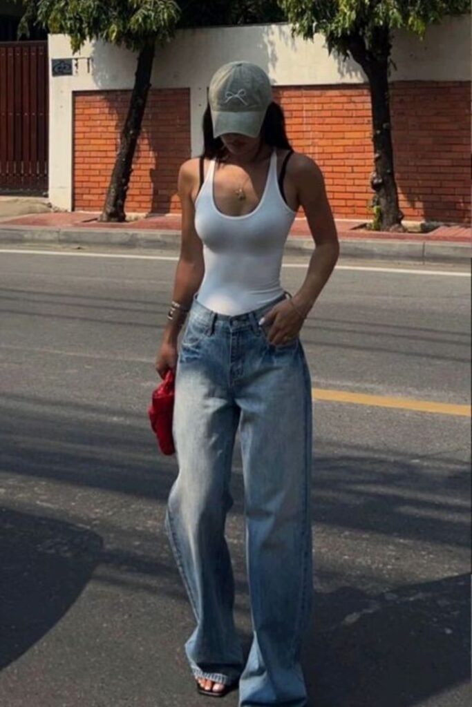 The key is to go for a fitted ribbed white tank rather than a flowy one. Ribbed fabric skims the body in a way that reads intentional, not lazy. Pair it with high-waisted straight-leg jeans — not skinny, not wide-leg, straight — and you’ve got the base of a look that could work from a coffee run to a casual lunch date.