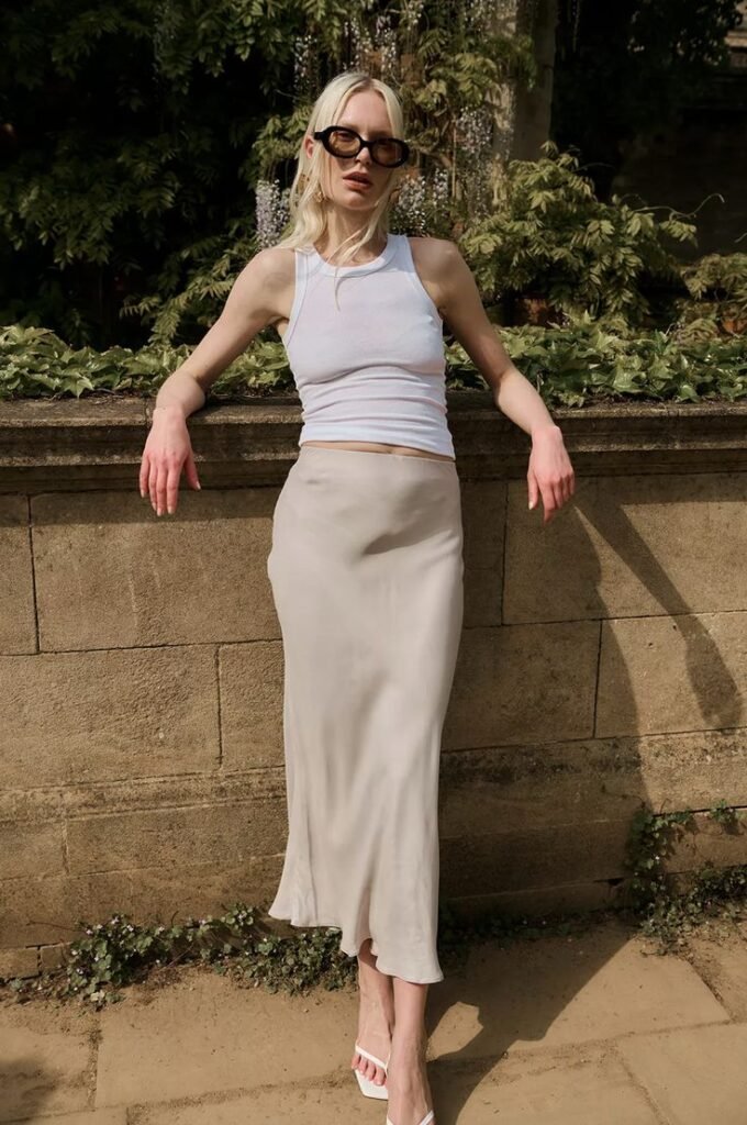 A satin or silky slip skirt in a bias cut is your best friend here. Go for a midi length if you want something more elegant, or a mini if you’re feeling bold. Tuck your tank fully in — no half measures on this one.
