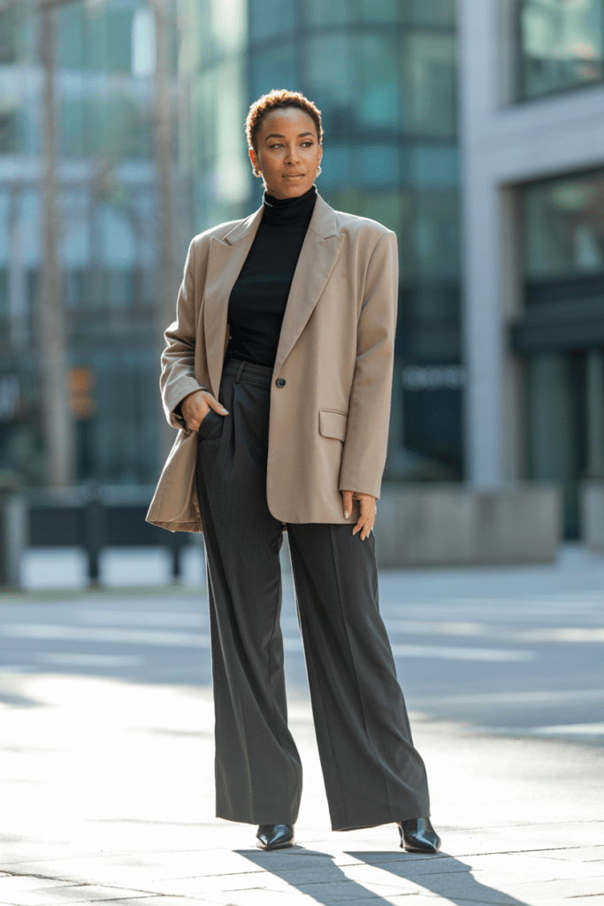 This outfit makes me feel like I could run a Fortune 500 company (even though I’m just running to brunch). An oversized blazer, fitted turtleneck, and wide-leg trousers create this elongated silhouette that’s both professional and stylish.