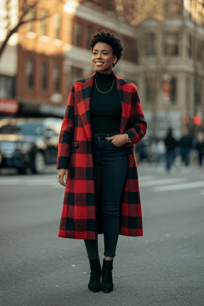 A plaid coat adds instant personality to any outfit. I have a red and black plaid coat that I wear over basic black pieces—black turtleneck, black jeans, black boots—and suddenly I look like I put way more effort into my outfit than I actually did.