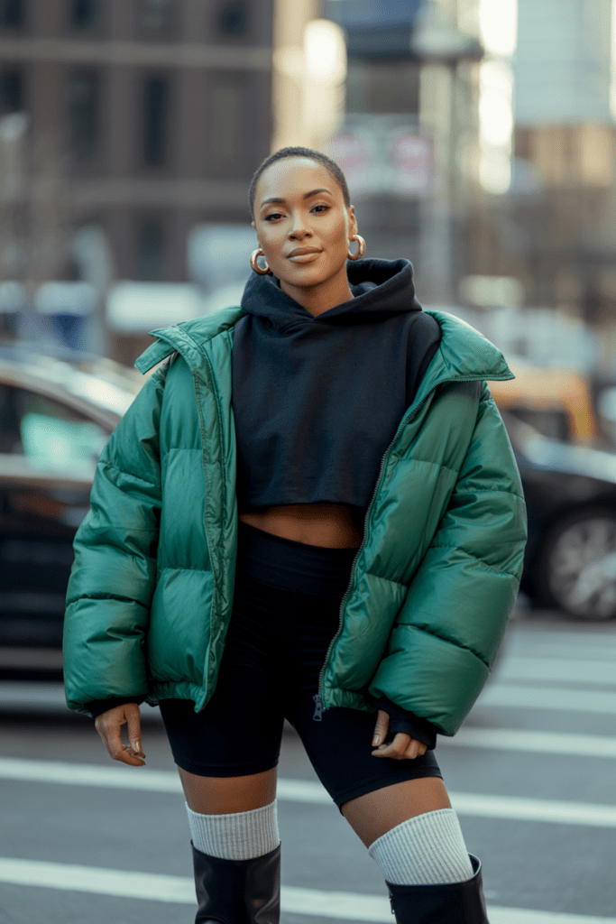 This look screams “I’m fashionable AND I understand layering.” I throw on my favorite oversized puffer jacket—preferably in a bold color like emerald green or burnt orange—with biker shorts underneath and some chunky combat boots.