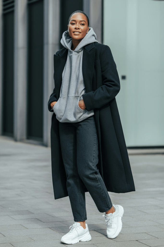 The long coat elevates the hoodie, making it look intentional rather than like you just rolled out of bed (even if you did—no judgment here).