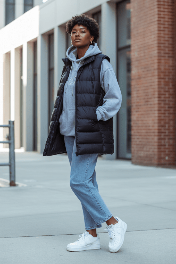 Okay, hear me out on puffer vests. I know they seem basic, but they’re actually styling gold when you layer them right. I wear mine over a hoodie with straight-leg jeans and Air Force 1s for a casual, athleisure-inspired look.