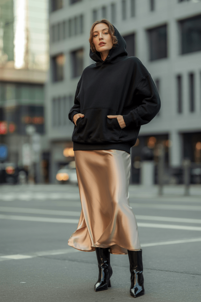 This combo sounds weird until you try it, and then you’re obsessed. A silky slip skirt under an oversized hoodie creates this unexpected texture play that’s ridiculously cool.