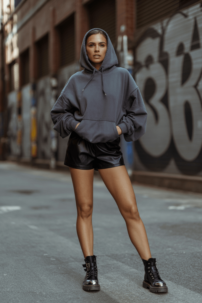 This combo has serious attitude. The tough, edgy vibe of leather shorts gets softened by the casual hoodie, creating this perfect balance. I usually go for: