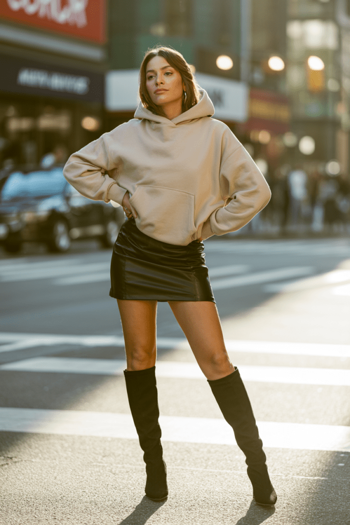 Okay, this one’s for when you’re feeling yourself. A tight bodycon skirt under an oversized hoodie creates this sexy-but-covered vibe that’s seriously underrated.