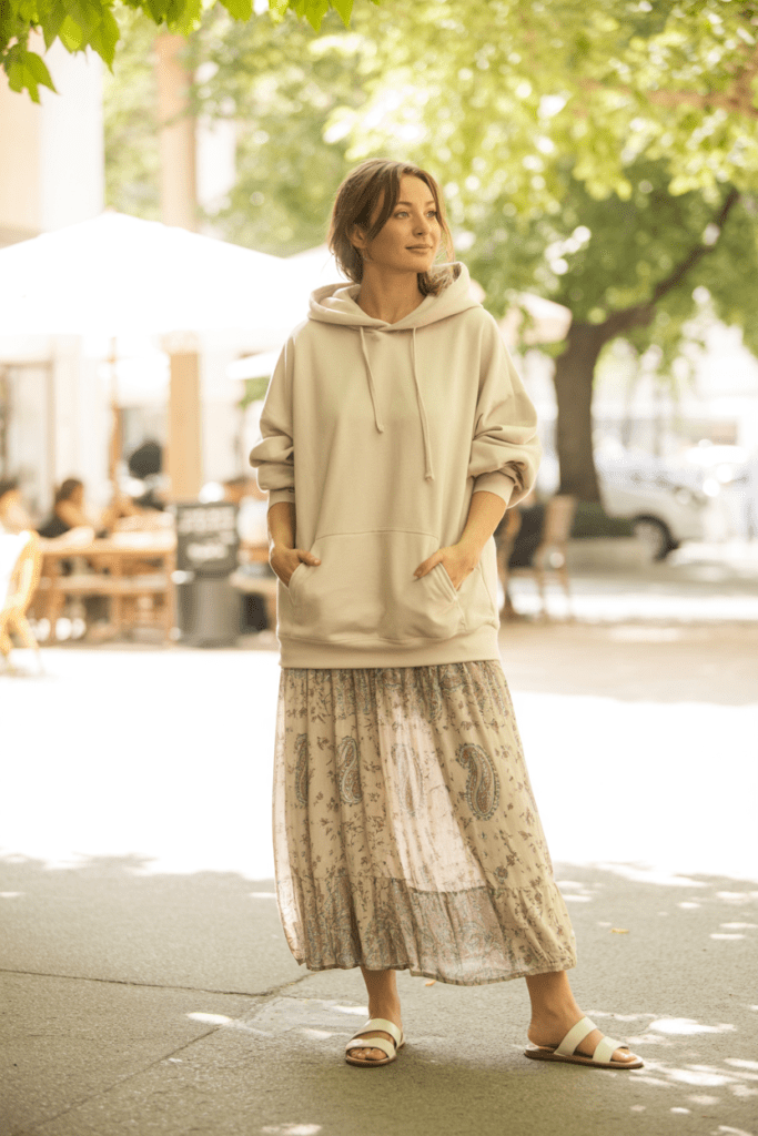 The maxi skirt adds drama and movement, while the hoodie keeps things casual and approachable. This works especially well with: