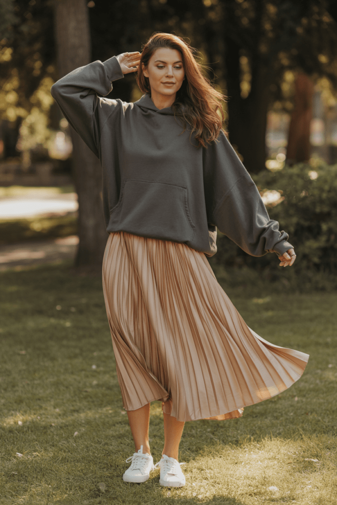 A flowing midi skirt paired with an oversized hoodie is the ultimate feminine-meets-casual combo. I’m talking about those silky, pleated midi skirts that make you feel like you’re gliding instead of walking.