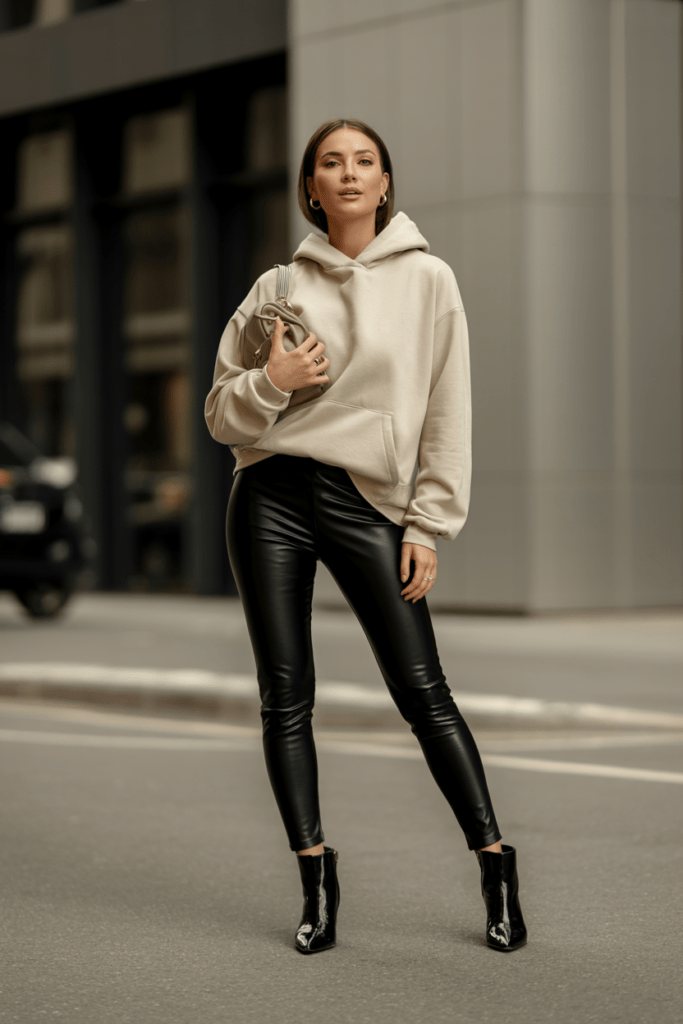 The contrast between the casual hoodie and the sleek, structured leggings creates this cool high-low vibe that fashion people go crazy for. Add some ankle boots and a structured bag, and you’ve basically transformed into someone who “doesn’t try too hard” but clearly does.