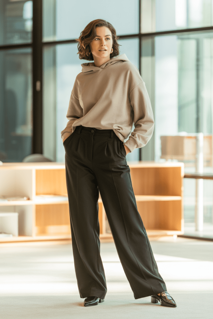 This works especially well with neutral-colored hoodies—think cream, grey, or black. The wide-leg trousers add structure and sophistication, while the hoodie keeps things approachable. Add loafers or pointed-toe flats, and you’ve got an outfit that works for casual Fridays or creative industry meetings.