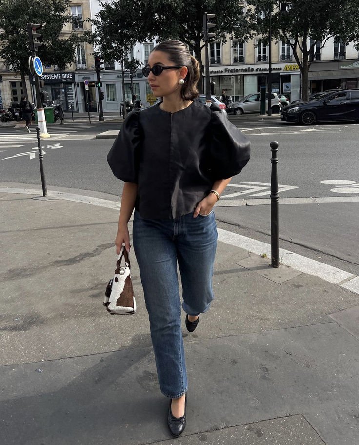 A balloon-sleeve blouse + straight-leg trousers + heeled mules creates trend-aware energy without showing skin.