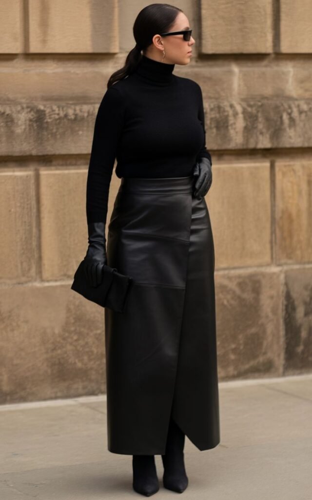 4. The Black Leather Skirt + Button-Down Shirt (The Power Outfit)