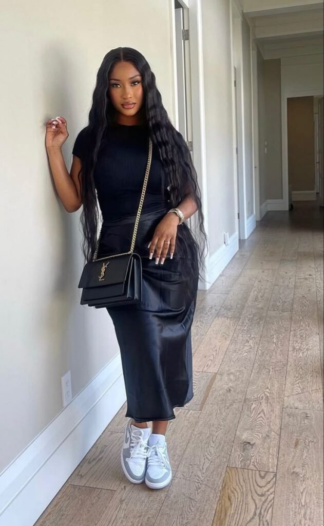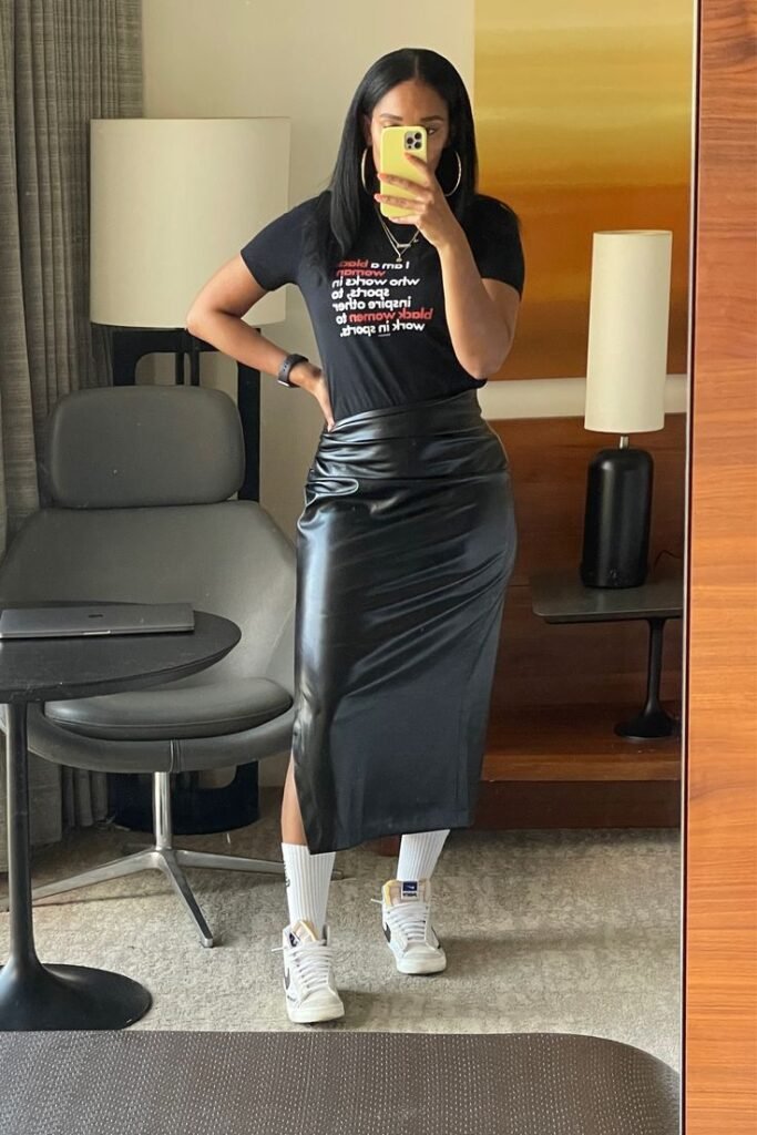 A pencil skirt styled casually is honestly… iconic. Pair it with a plain tee, a cute sneaker, and maybe a baseball cap if you’re feeling bold.