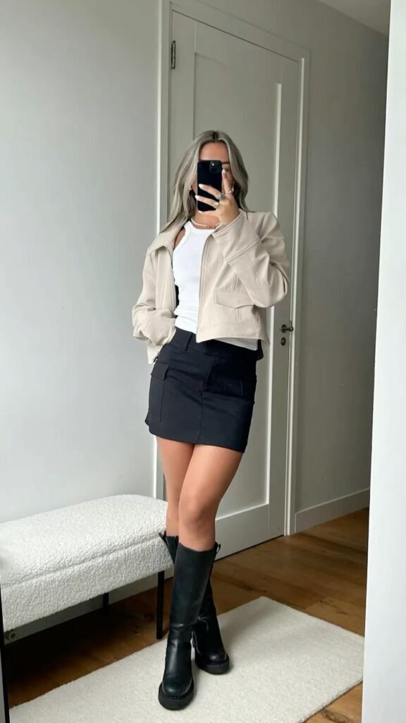 Pair it with a cropped jacket—denim, bomber, leather, anything—and you get a structured, balanced outfit that’s low-effort but high style.