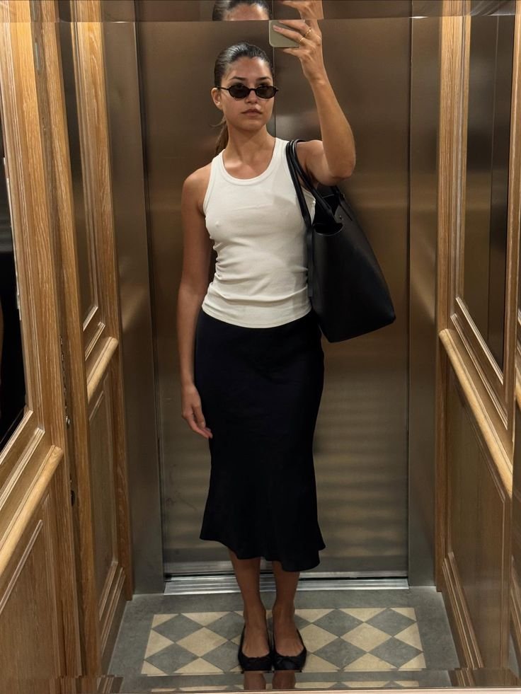 A black satin midi skirt with a fitted tank gives major “quiet luxury cousin who travels a lot and drinks matcha” vibes.