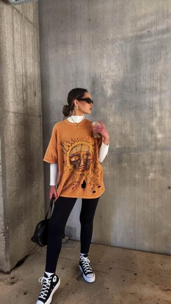 Oversized cotton tees, boxy tanks, airy tunics, and relaxed button-down shirts balance out fitted leggings beautifully. The contrast keeps the look flattering without looking try-hard. I love how a slouchy top makes leggings feel styled instead of default.
