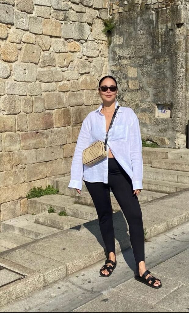 If I had to name one piece that saves leggings outfits all summer long, it would be the lightweight button-down shirt. Linen, cotton, or soft poplin fabrics work best, and slightly oversized fits look the most effortless.