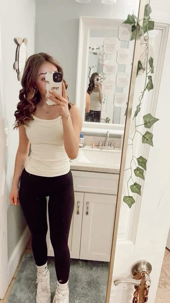I personally gravitate toward ribbed tanks, square necklines, and structured racerbacks. These styles feel relaxed but still polished enough to wear outside the house. When I pair them with leggings, I usually add one intentional element — sleek sandals, a crossbody bag, or bold sunglasses — to signal that this was on purpose.