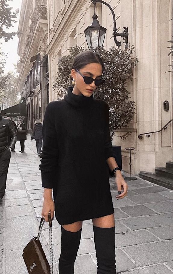 - Mini sweater dress + thigh-high boots + wool wrap coat