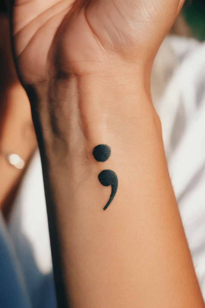 The semicolon tattoo carries serious weight despite its size. It’s become a symbol of mental health awareness and resilience—the idea that your story isn’t over yet. The author could have ended the sentence but chose to continue.